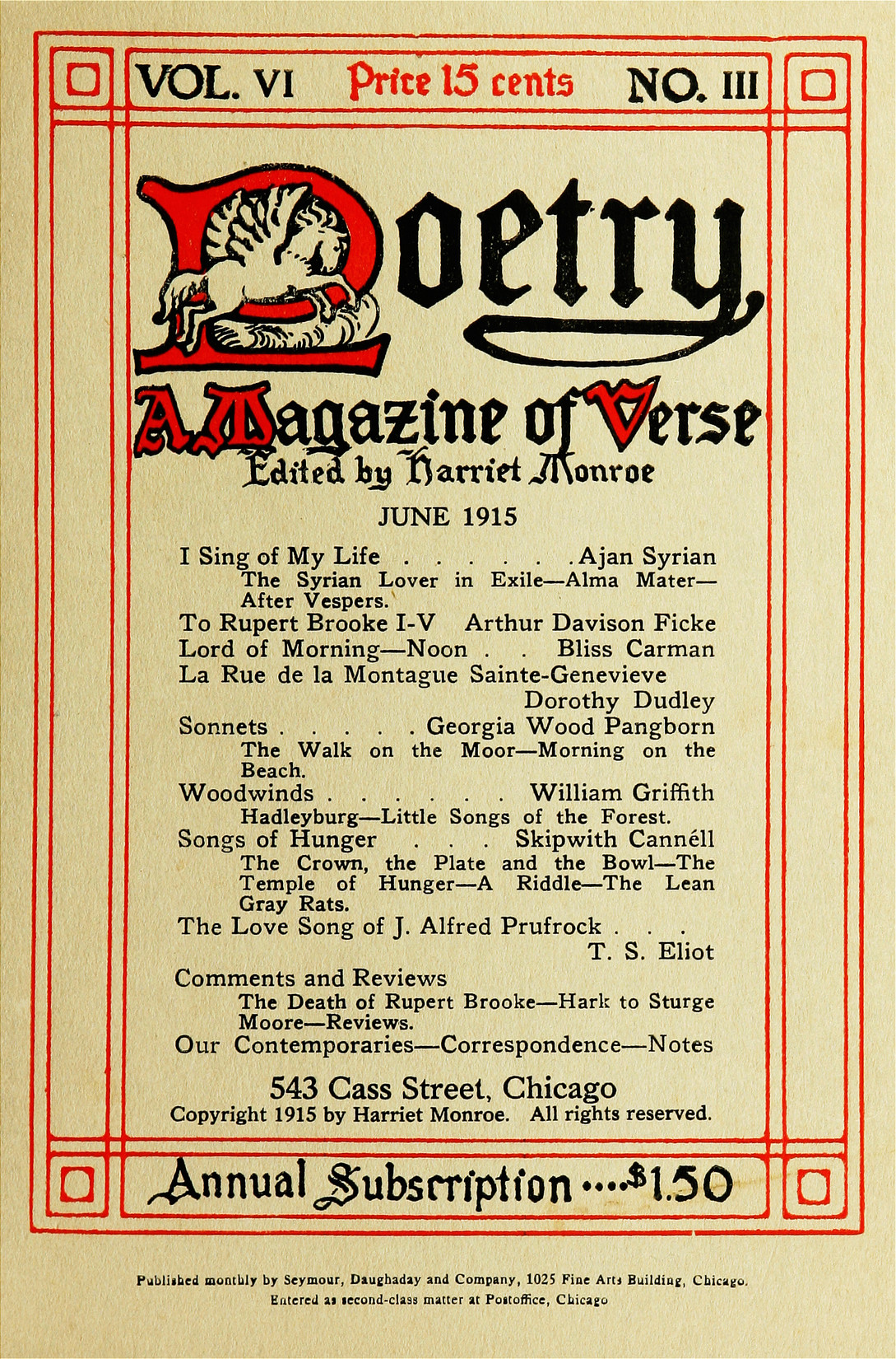 Founded in Chicago by Harriet Monroe in 1912, Poetry is the oldest monthly devoted to verse in the English-speaking world. Monroe’s “Open Door” policy, set forth in Volume 1 of the magazine, remains the most succinct statement of Poetry’s mission: to print the best poetry written today, in whatever style, genre, or approach. The magazine established its reputation early by publishing the first important poems of T.S. Eliot, Ezra Pound, Marianne Moore, Wallace Stevens, H.D., William Carlos Williams, Carl Sandburg, and other now-classic authors. In succeeding decades it has presented—often for the first time—works by virtually every major contemporary poet. In 2011, the magazine was honored with two National Magazine Awards. It celebrates its centennial in 2012.